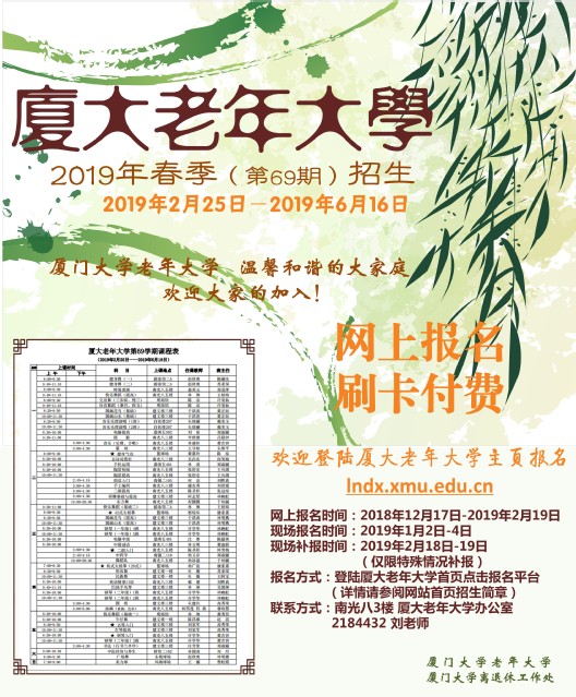 厦大老年大学2019年春季(第69期)课程招生将于2018年12月17日正式启动。本学期增设了二胡入门、古琴入门、钢琴入门、健身气功、42式太极拳、杨式太极拳(28式)等课程,共计53个教学班,供广大离退休教职工挑选。