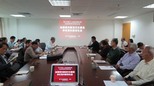 按照市社科普及周的活动安排,市老教授协会20171111上午9:00-11:30,在厦大建文楼三楼老教授协会会议室,成功举办“加强党内政治文化建设,净化党内政治生态”为主题的学习贯彻党的十九大精神,推动党的建设伟大工程理论研讨会。有来自厦门大学、集美大学等高校老教授和厦大马克思主义学院师生及相关学院硕、博研究生近50人参会。应邀莅会指导的有原厦大党委副书记、现校关工委主任陈力文,原厦大党委宣传部长、现校关工委副主任郑保东,市社科联学会部调研员陈家炎等同志。