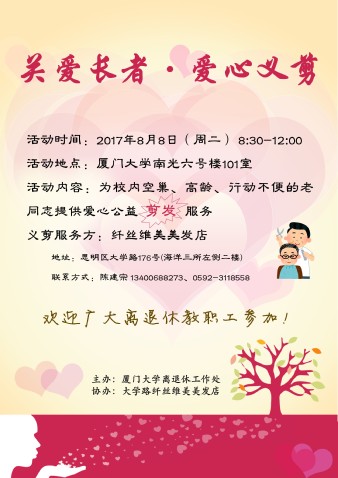 8月8日上午,由厦门大学离退休处主办,大学路纤丝维美美发店协办的“关爱长者·爱心义剪”公益剪发志愿服务活动在南光六号楼101室开展。
