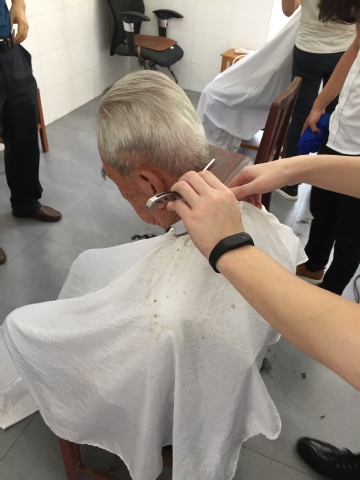 活动尚未开始,不少居住在校内白城、海滨、东区片区的我校离退休老同志便闻讯而来,他们边排队等候、边拉家常聊近况,南光六101室顿时人声鼎沸。活动场所设备简陋,几张椅子、几把剪子,四名义剪志愿者一字排开,手法专业、动作娴熟,很快就为老同志修理出一个个干净利落的发型。在现场工作人员和义剪志愿者的贴心服务下,参与活动的老同志个个喜笑颜开,纷纷为此次活动点赞。家住海滨的黄老师说:“天气炎热,组织这个活动为我们老人家免费理发,修短头发之后,不仅是为我们送来了一丝凉爽;年轻人的爱心,也给我们送来一股暖流,我这心里热乎乎的。”