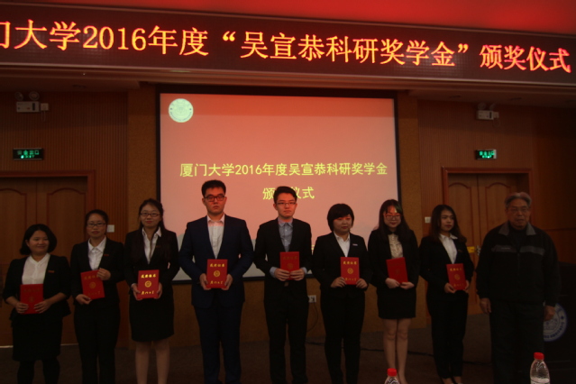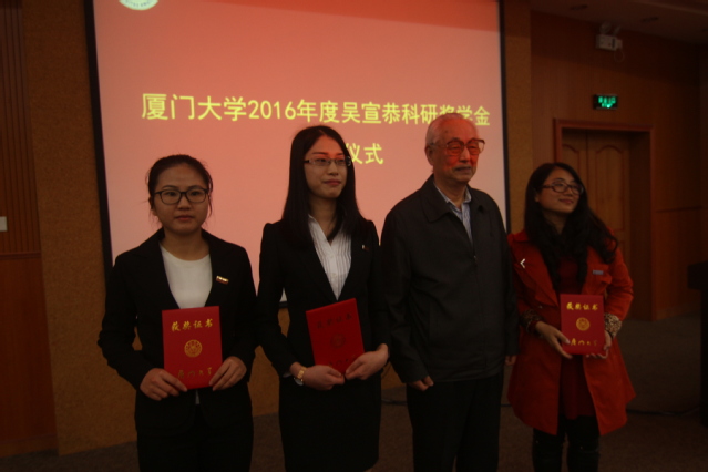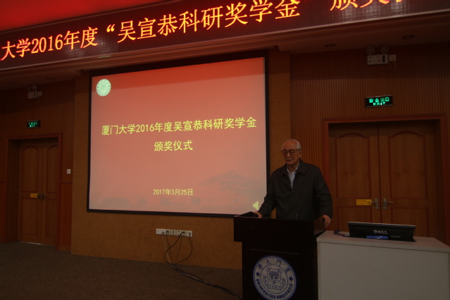 3月25日上午,2016年度“吴宣恭科研奖学金”颁奖仪式在思明校区化学报告厅举行,该项奖学金旨在鼓励学生运用马克思主义理论指导科学研究。校党委副书记林东伟,经济学院教授吴宣恭,校关工委陈力文、黄如彬、苏振富、杨敬达等出席并为获奖学生颁奖,学校相关部门负责人,第七期学生马克思主义理论研修班学员和马克思主义学院师生代表参加。
