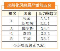 “彭博夕阳指数”涵盖全球178个国家的数据。报告显示,世界劳动人口比例的收缩速度快于预期,越来越少的中青年人去照顾越来越多的老年人。法国和新加坡是老龄化风险最严重的两个国家,平均每2.2名在职人员养1位退休者,俄罗斯(2.4:1)和泰国(2.6:1)紧随其后。中国平均每3.5名劳动力承担1位退休者的养老金,合理的数据是7.3人承担1个老人的开支。