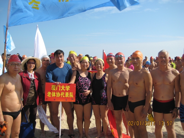 2月1日,由国家体育总局游泳运动管理中心、中国游泳协会、厦门市体育局主办的2017年“全国冬泳日”系列活动(厦门站)暨第十九届迎新春海峡两岸冬泳活动在厦门市厦金跨海横渡救生指挥中心海滩举行。包括中华台北、金门、闽南金三角等全国各省市共36支队伍近千人参加了活动。厦门大学老体协近三十位冬泳爱好者在队长郭忠平的带领下参加了此次活动。