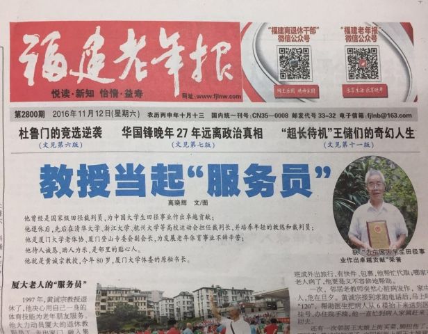 【写在前面】11月12日,《福建老年报》头版“社会记录”栏目刊发了题为《教授当起“服务员”》的文章,介绍了我校退休教授黄诚宗老师。今天,小编就带您走近可敬可亲的黄教授。