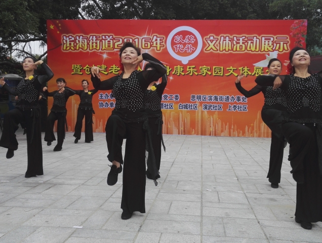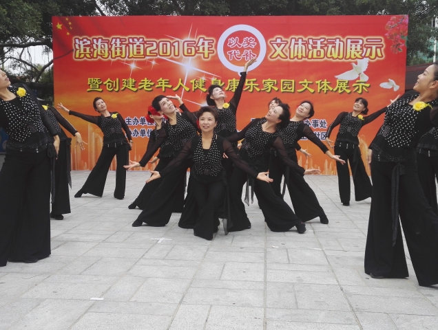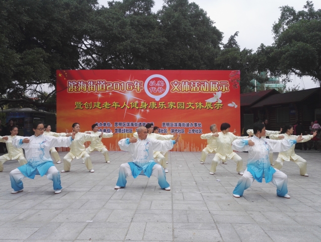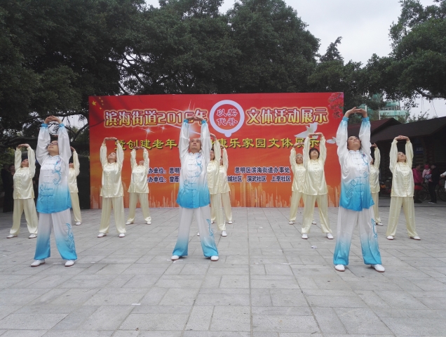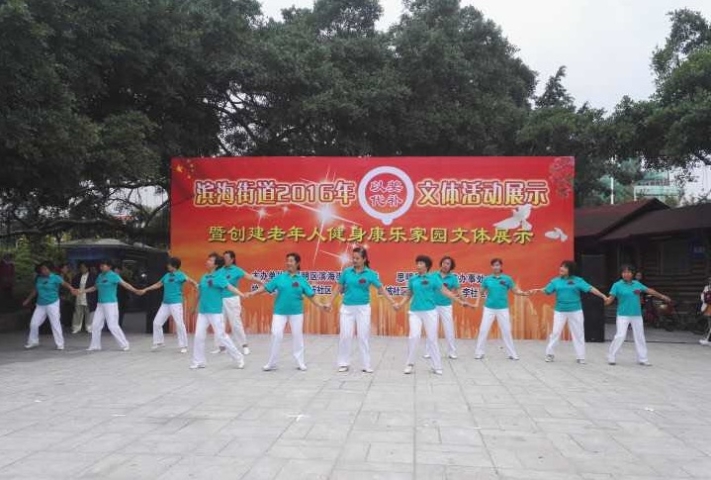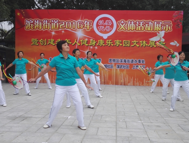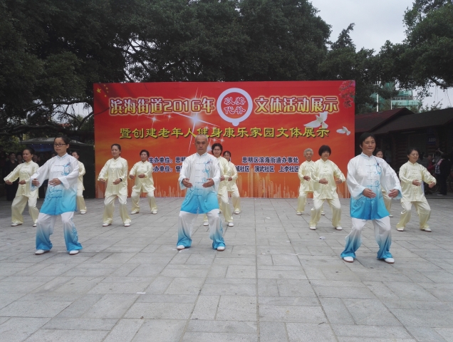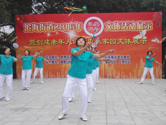 2016年11月24日下午,厦大老体协健身气功队、柔力球队、广场舞队、健美操队4支队伍,分别代表演武社区、白城社区,参加了滨海街道组织举行的“2016文体活动展示暨创建老年人健身康乐家园文体展示”活动。