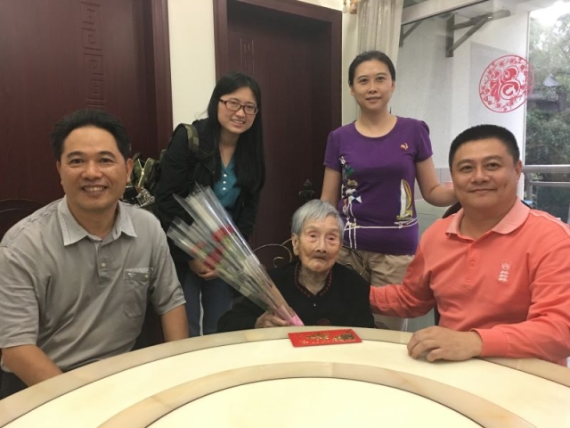 我校另一位百岁老人——刚满100岁的外文学院的李荷珍,目前在北京居住,与子女享受天伦之乐。我们在10月8日也带去问候和祝福,送上慰问金。