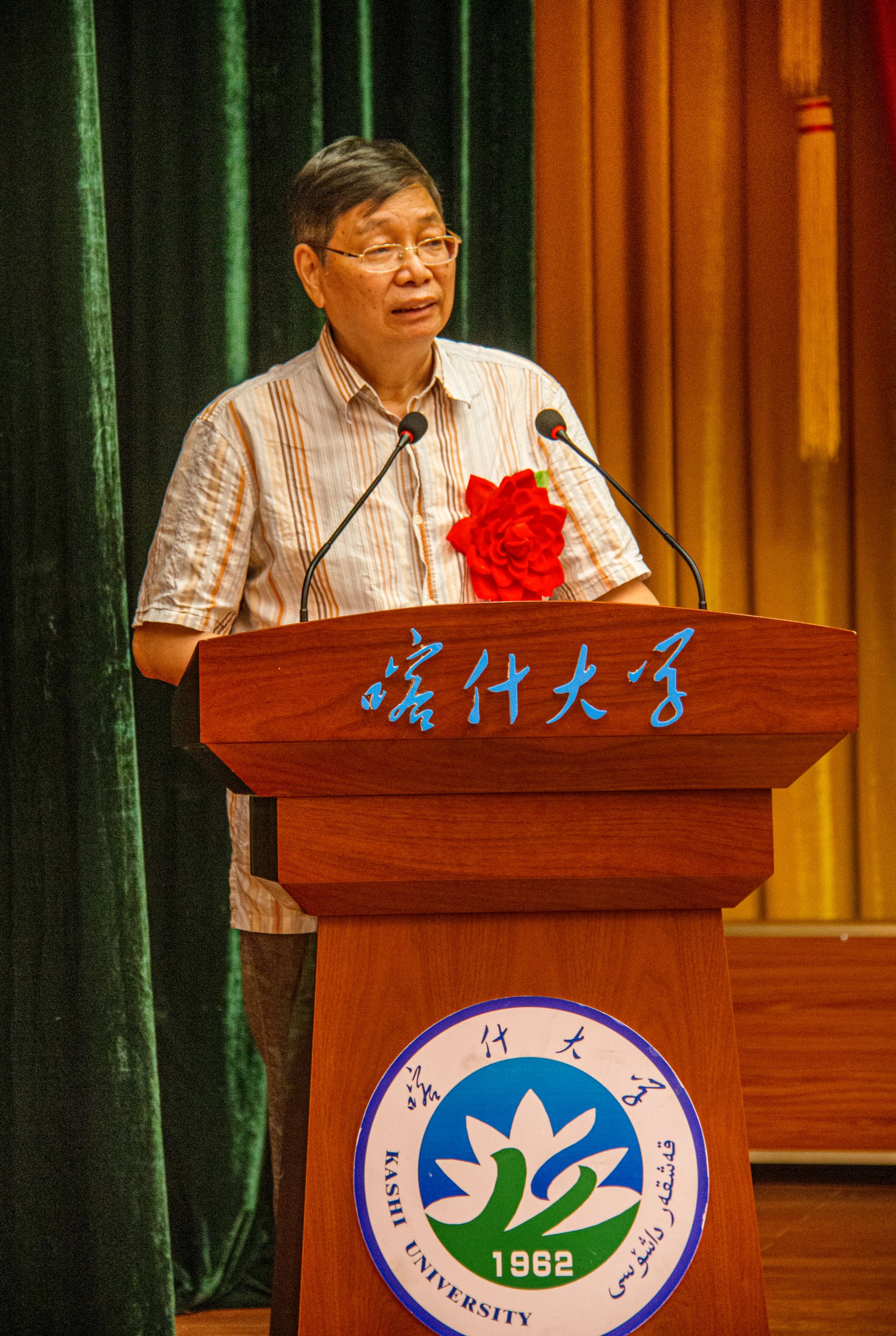 苏新春教授代表“银龄教师”在会上发言。他说,在喀大支教一年,既感到光荣也感到幸运,在这里的收获比付出多得多。收获了思想历练和认识的升华,这儿有一支坚守南疆、甘于奉献的师资队伍,从他们身上学到了坚定与坚韧;收获了师生的尊重和信赖,学生在课程结束时对自己说“可以很自豪地说‘我是苏老师的弟子!’”;收获了母校的关心,厦门大学邓朝晖副校长亲自带队飞越万里来到喀什看望我和另一位银龄教师刘润忠教授,让我们感受到了温暖;收获了喀大校领导和院系领导的高度信任及学校和后勤部门无微不至的照顾,事无巨细、时无早晚、随叫随到的服务及时而周到。向喀大领导、老师、后勤工作人员表示深深的谢意。