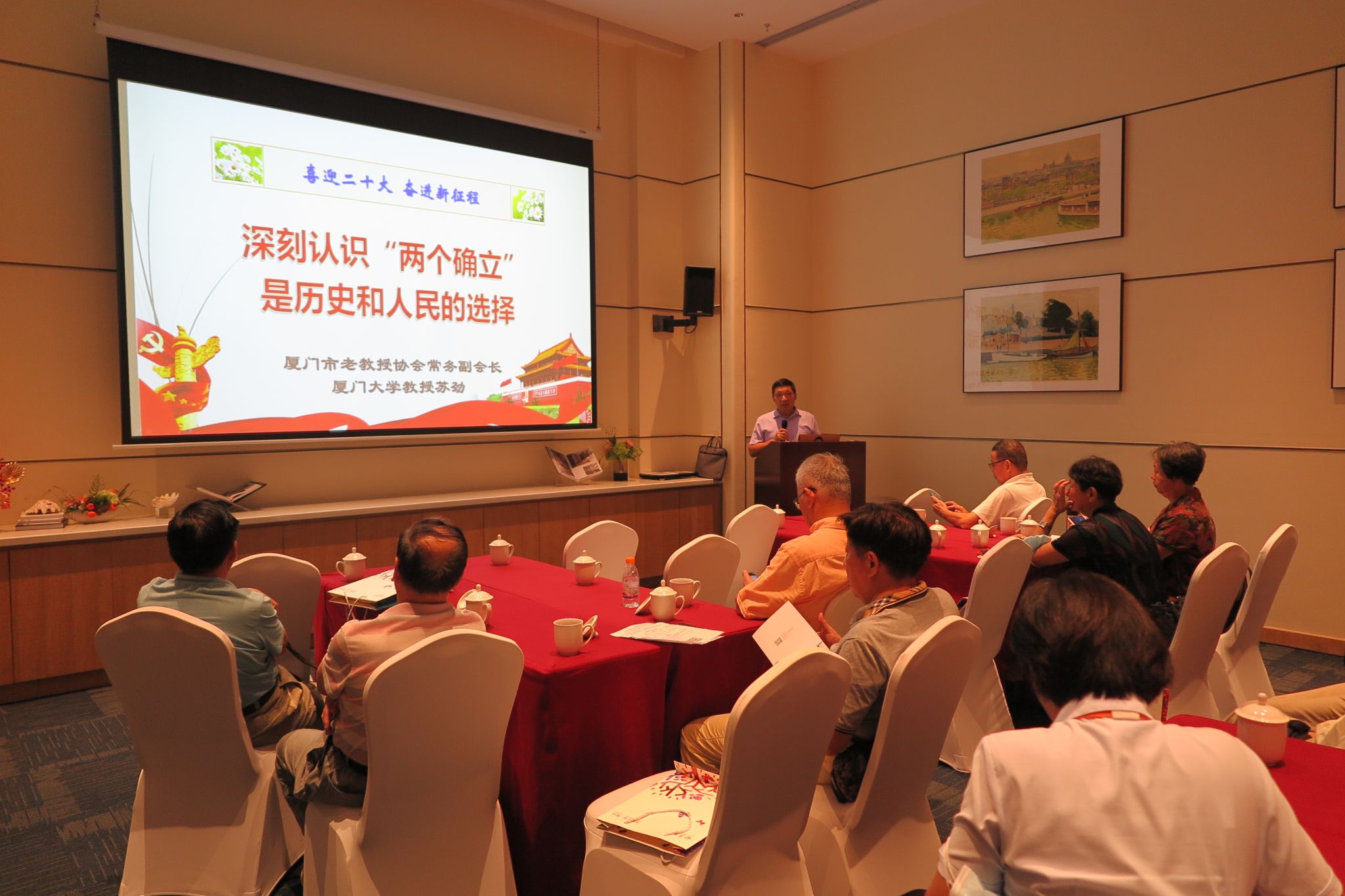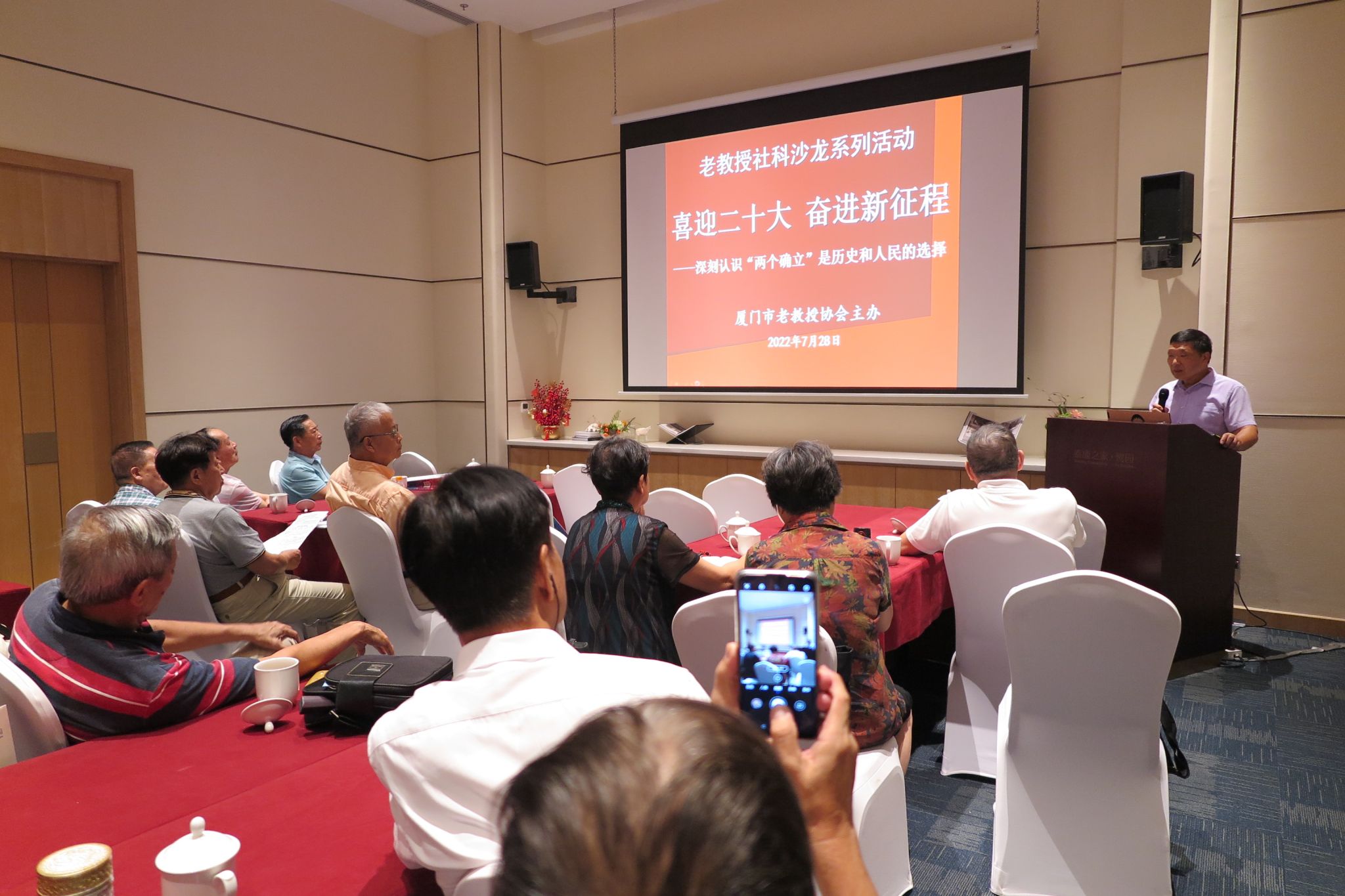 2022年7月28日,厦门市老教授协会在同安区泰康之家¬鹭园举办《喜迎二十大 奋进新征程——深刻认识“两个确立”是历史和人民的选择》社科沙龙,老教授协会常务理事和泰康之家¬鹭园职工30多人参加。