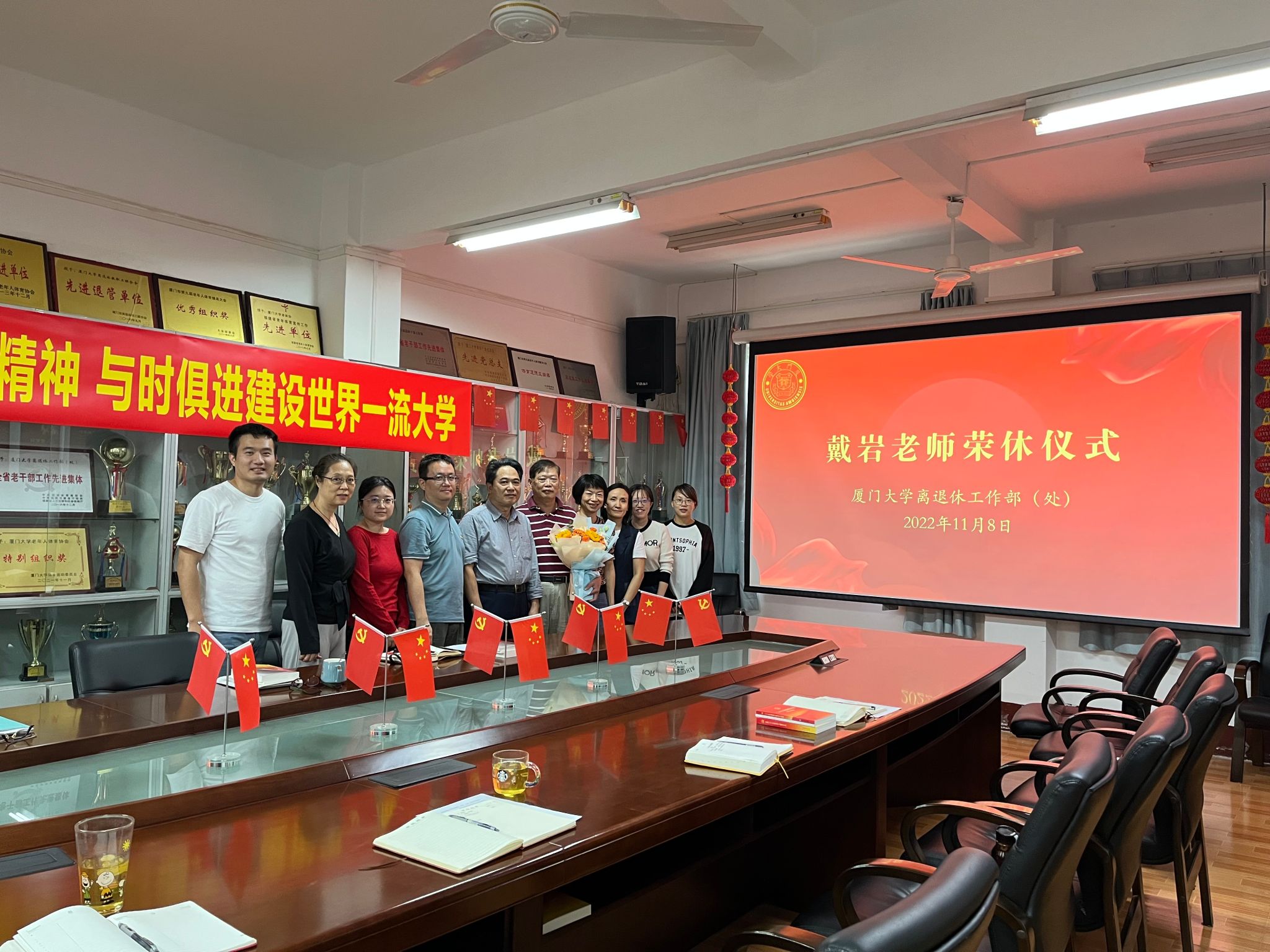 曾坤瑜对戴岩同志多年的辛勤付出给予充分肯定,并致以崇高的敬意和衷心的感谢。她表示,戴岩同志在厦大学习生活工作41年,是个名副其实的老厦大人,熟悉学校情况、熟悉老同志情况。她希望,戴岩同志能够“退休不褪色”,继续一如既往地关心支持学校的各项工作,多提宝贵意见和建议,发挥自身在宣传和档案方面的专业优势,为讲好厦大故事、传播厦大好声音赋能助力。