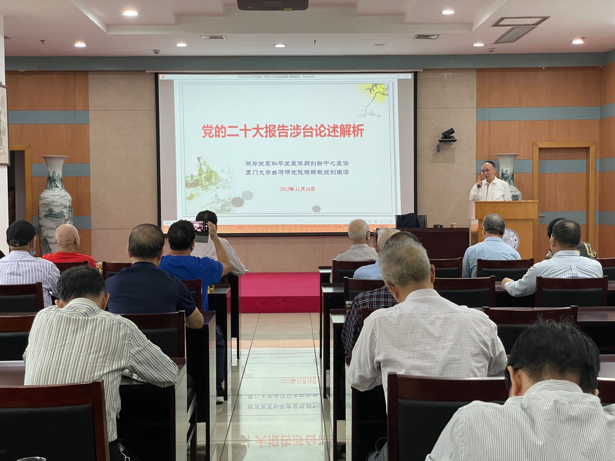 11月16日下午,两岸关系和平发展协同创新中心主任、台湾研究院特聘教授刘国深老师作《党的二十大报告涉台论述解析》专题报告。他用诙谐幽默的语言,从“中华民族伟大复兴的大局”、“两岸走向完全统一的进程”以及“战争与和平的辩证关系”三个层面系统、全面地为大家解读党的二十大报告涉台论述的主要内容,同大家分享了他独特的两岸交流经历。
