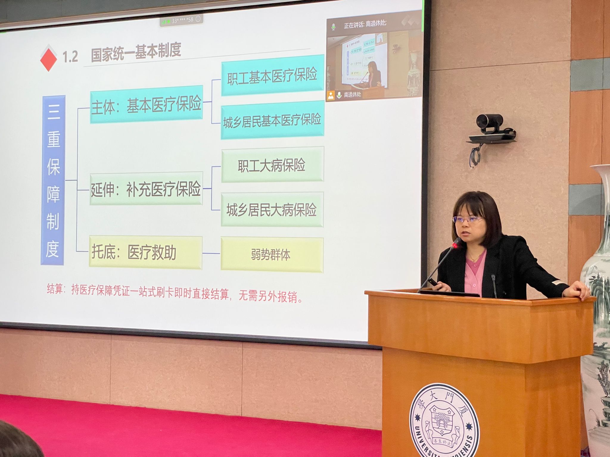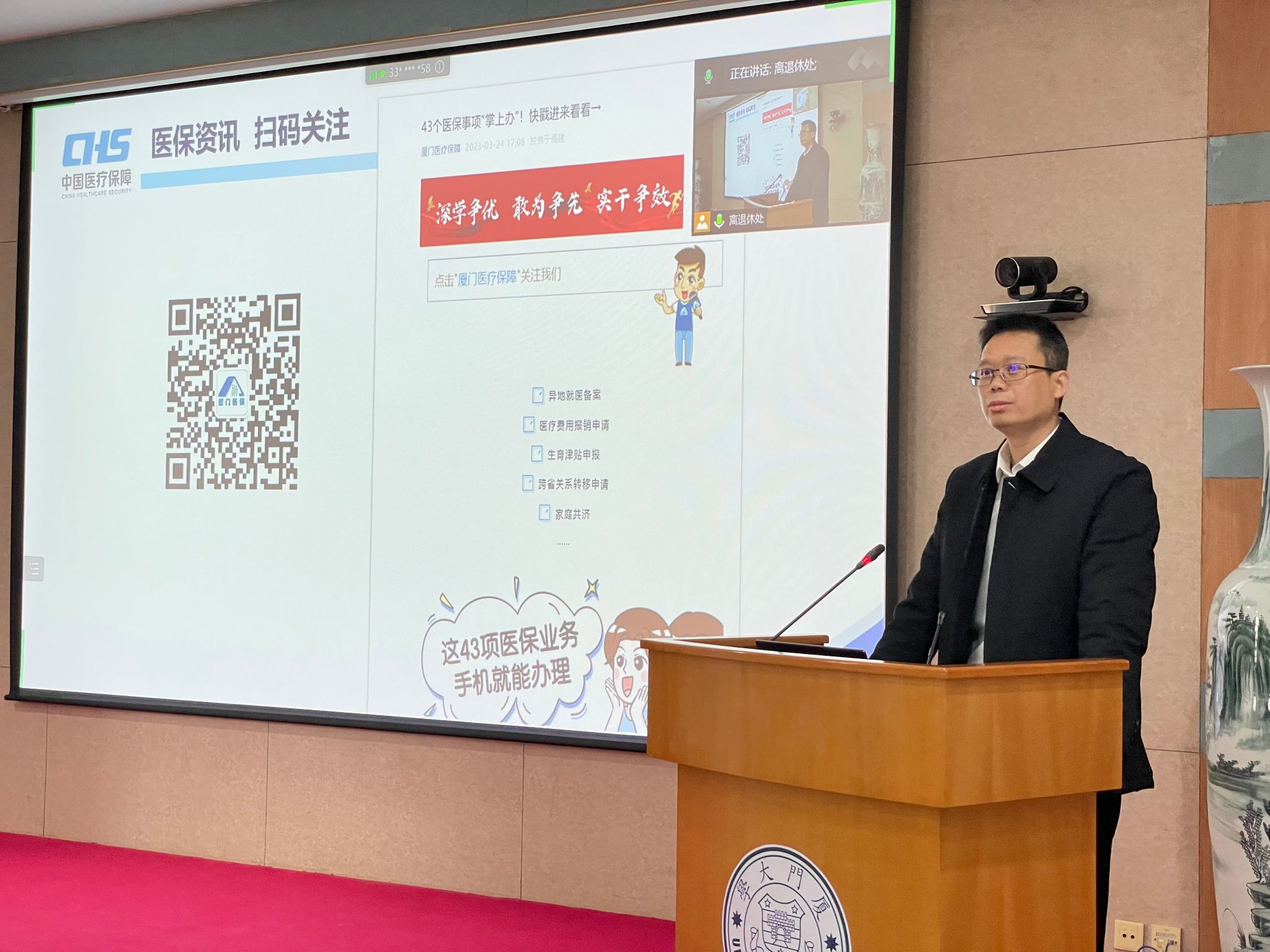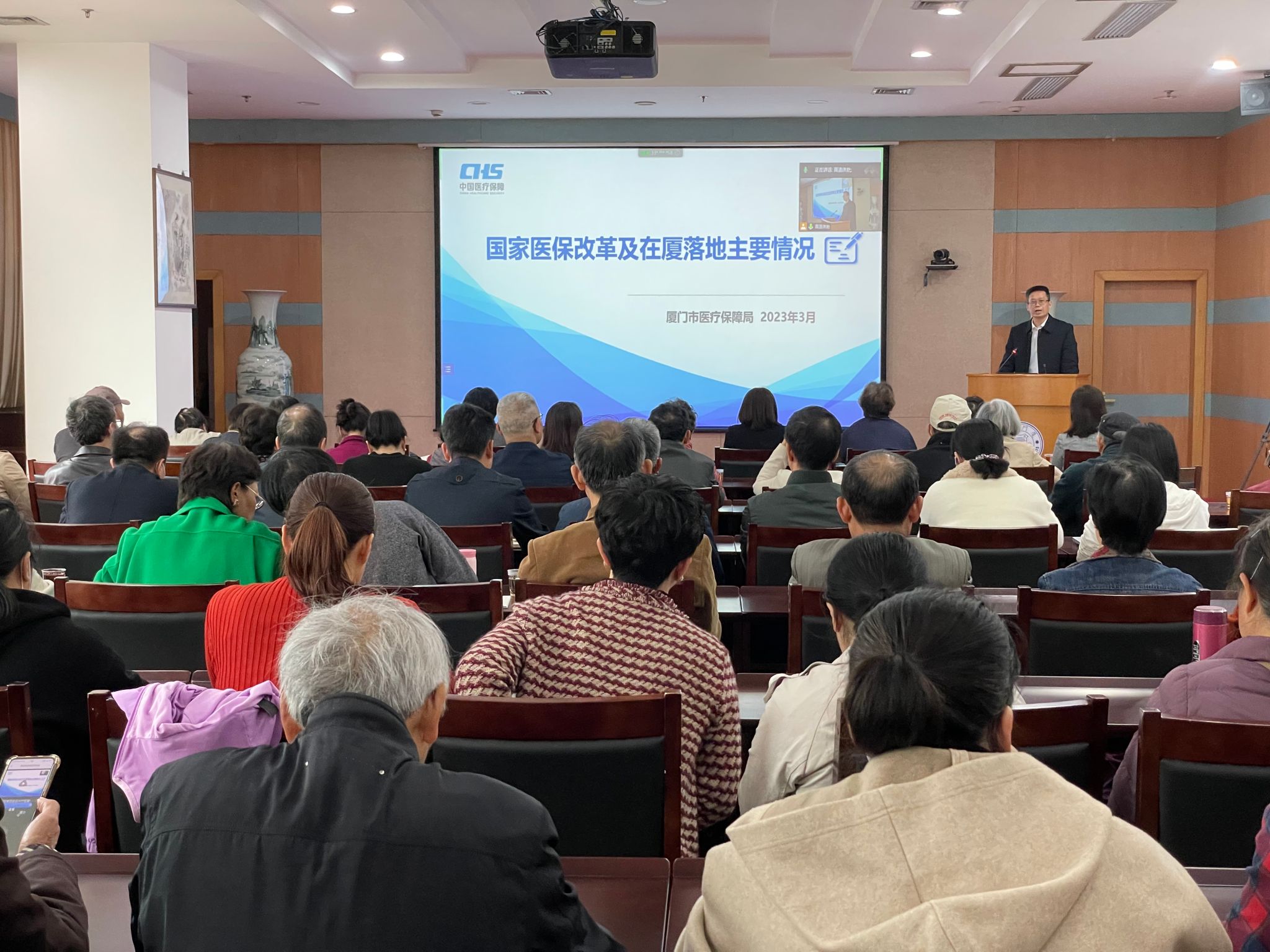 3月30日上午,离退休工作部在颂恩楼220会议室举办了国家医保政策改革解读专题讲座,邀请厦门市医疗保障局待遇保障处处长郑生、科长丁莉莉为大家介绍国家医保改革在厦门落地情况,解读厦门医疗保障制度改革政策。离退休老同志代表,各单位离退休工作联络员,白城、演武社区工作人员等100多人到场参加,近200位老同志通过线上观看的方式一同聆听了本次讲座。讲座由离退休工作部副部长贺文英主持。