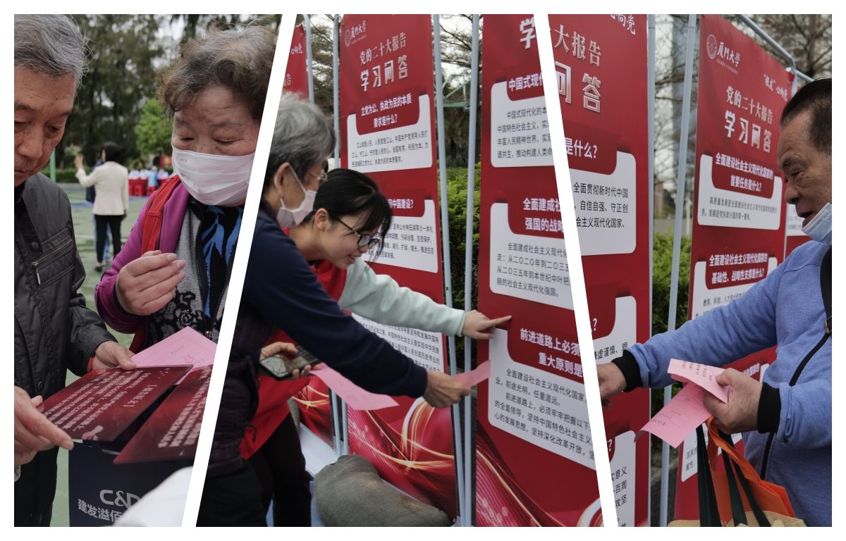 身穿红色马甲的学生志愿者们分散在游园现场的各个角落,用灿烂的笑容、热情的服务表达自己的敬老爱老之情,成为游园活动中一道靓丽的风景线。现场还有来自厦门大学附属翔安医院的专家们为老同志们提供健康义诊服务;来自银行、专科医院和多家养老服务机构的工作人员向老同志们介绍防诈反诈知识、专科病症常识和各类养老服务资源。本次活动还得到宣传部、保卫部、资产与后勤事务管理处、校团委和体育教学部等单位的大力支持。