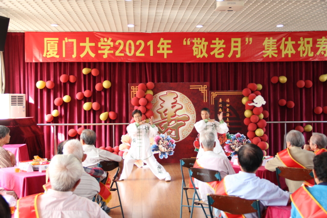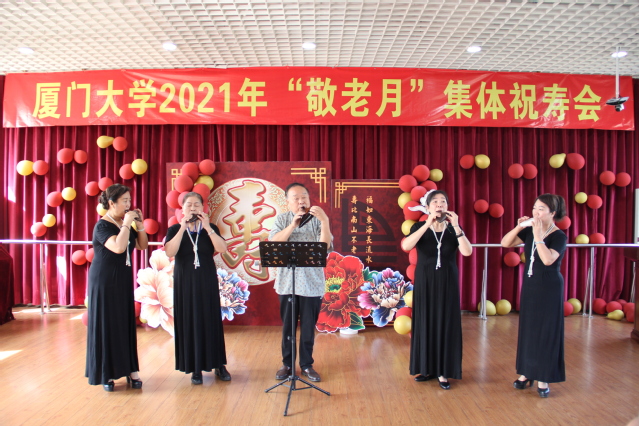 随后,厦门大学老年艺术团为老寿星们献上精心编排的健身气功八段锦、陶笛重奏、26式陈氏太极拳以及女生独唱等表演节目,精彩的演出为今天的祝寿会增添了许多欢乐,赢得了老同志们的阵阵掌声。来自体育教学部的老寿星吴世民老师还现场即兴为大家高歌一曲《那就是我》,表达自己对祖国的热爱赞美之情。