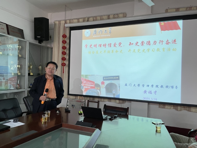 黄福才教授为老同志们作题为《学史明理增信爱党 学史崇德力行奋进》的专题辅导报告。他首先明确了党史学习教育要树立正确党史观、把握大历史观,提出要着力明理增信、学史崇德爱党、力行做好工作。随后,他结合厦门大学早期革命史的详实史料,展现了厦大的革命者在中国革命各个历史时期及重要事件发生时,追求真理、投身革命、忠诚奉献、勇于担当的崇高革命精神,以及厦大党支部早期活动为中国革命事业播撒火种、拓展阵地的积极贡献。他与老党员们共勉,在党史学习教育中要学习在前、把握重点、深刻领悟,方能做好党的光荣传统和优良作风的忠实传承者。