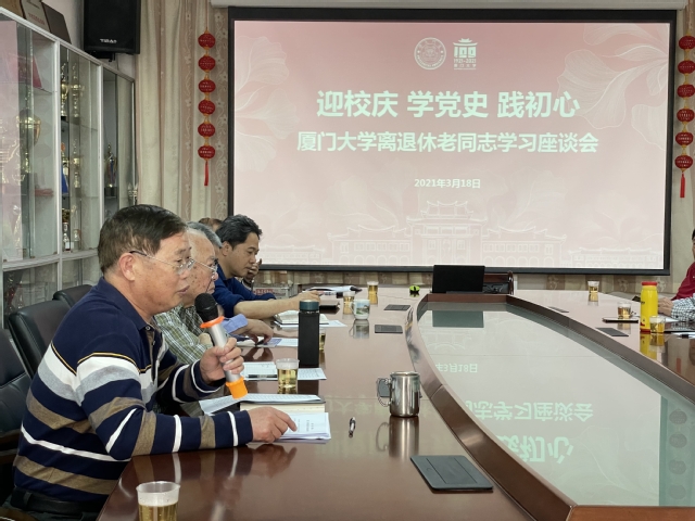 最后,老同志们结合自身经历,畅谈感想体会。大家认为,通过两场报告,对百年校庆筹备工作有了更为全面深入的了解,为厦门大学拥有的百年辉煌历史和取得的成绩倍感骄傲自豪,同时在学习厦门大学校史、革命史的过程中也加深了对中国共产党百年历程的了解。张礼龙教授表示,看到学校百年校庆各项活动安排周到、设计人性化感到十分欣慰,同时校友们慷慨捐助学校建设也令人非常感动。周妙群副教授说到,作为一个66年党龄的老党员,我看到我们党虽然在发展中历经曲折,但我们要从大局看、向前看,总结成功经验和错误教训,在党史学习教育中跟着党走向更加美好的未来。杨聪凤副教授谈到,听了黄福才教授对厦大早期革命史的讲述,作为厦大人感到十分光荣,同时也感受到历史赋予的重要使命,作为老党员要尽我们的能力,传承革命精神,为实现中华民族伟大复兴继续做贡献。