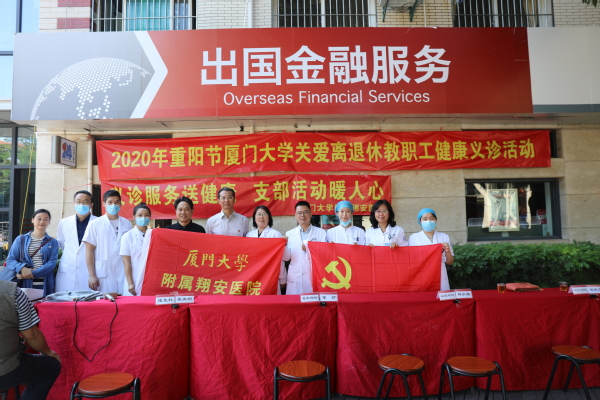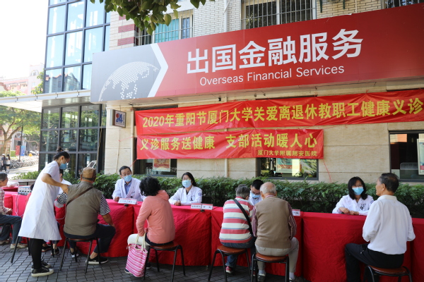 10月25日,离退休工作处携手厦门大学附属翔安医院共同举办了“2020年重阳节厦门大学关爱离退休教职工健康义诊活动”。活动现场设于三家村学生活动中心广场,来自翔安医院老年病科、康复医学科、泌尿外科、内分泌科和心内科的医疗专家和医护人员为我校离退休教职工提供健康义诊服务。校党委副书记赖虹凯来到现场看望慰问老同志。