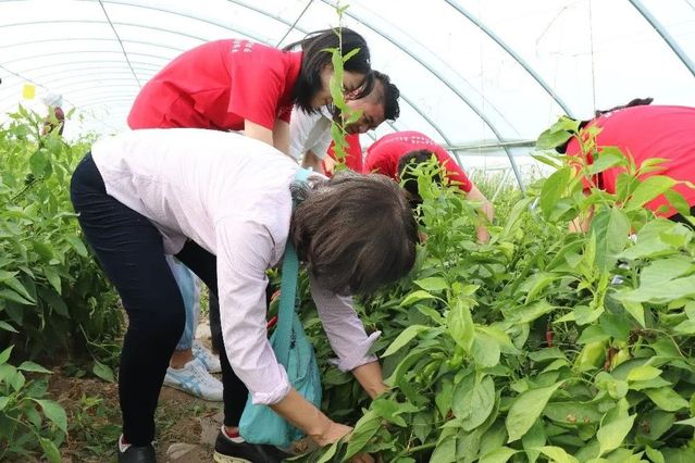 在村种植园区的辣椒种植大棚里,老师、同学共同向采摘工人们虚心学习了采摘辣椒的方法要领,挽起袖子加入到了收获辣椒的大军之中,亲身感受田间劳作的辛苦与劳有所获的喜悦。