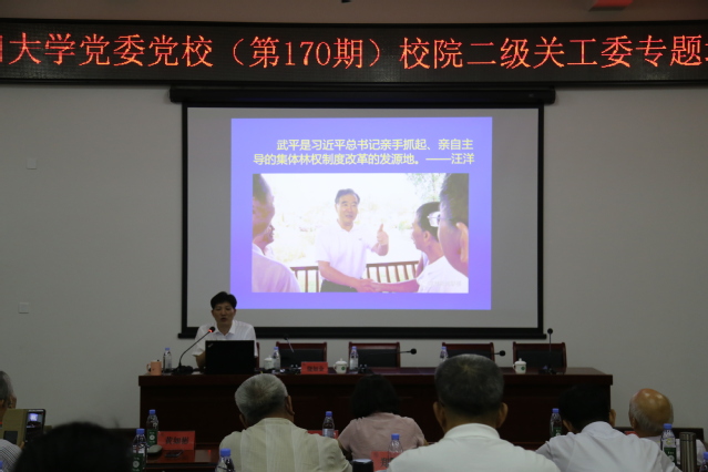 校关工委主任陈力文最后讲话,她说尽管参加这次学习的老同志年龄大,行程安排紧,但大家都非常积极主动,学习热情高,表现了很高的政治觉悟。在党校、离退休处、学生处、团委、宣传部的支持和大家共同努力下,这次学习很好地完成了“决战决胜脱贫攻坚,坚定传承红色基因,普及学习民法知识”学习任务。