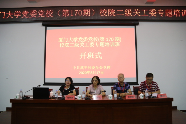 8月17日下午,开班仪式暨专题辅导报告在武平县继续教育基地举行,戴岩秘书长主持开班仪式。党校副校长何丽新教授作开班动员讲话,她提出了本次学习班的学习任务,强调我们要通过此次专题学习班共同坚守初心、牢记使命,弘扬红色文化、传承红色基因,认真学习习近平新时代中国特色社会主义思想,提高思想理论水平,进一步做好关心下一代工作,为厦门大学建设中国特色世界一流大学的伟大征程贡献一份力量,献礼建党百年和建校百年。
