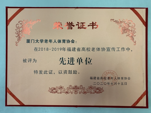 近日,福建省高校老体协公布2018-2019年高校老年体育宣传工作先进单位和先进工作者评选结果,我校老体协被授予先进单位荣誉称号,校老体协副主席兼秘书长赵家琪被授予先进工作者荣誉称号。