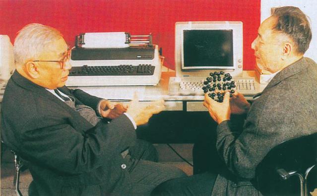 1990年,张乾二(右)与卢嘉锡讨论原子簇化合物