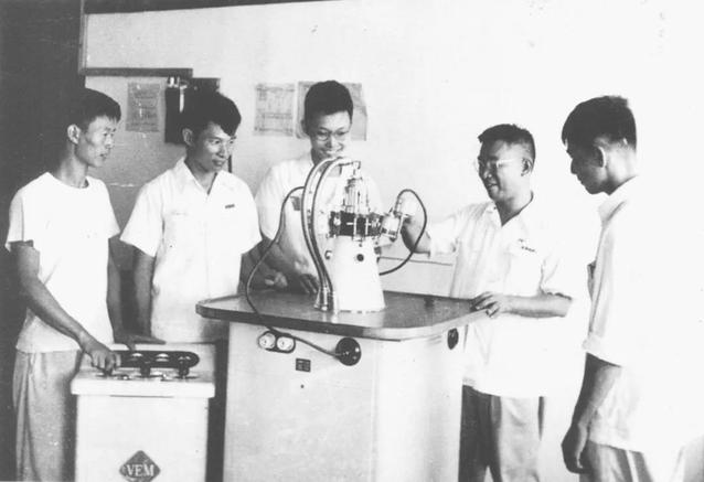 1956年,卢嘉锡在晶体衍射实验室中讲解,图中左二为张乾二