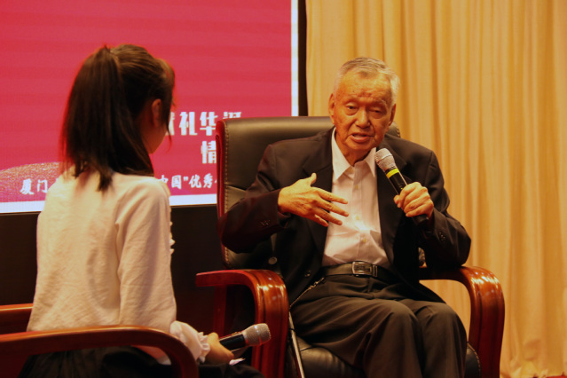 活动对学校第二届“读懂中国”活动优秀作品进行展播、选读,并邀请“五老”同志现场访谈交流。一个个征文朗诵,一段段视频展播,生动讲述唐崇惕院士、张礼龙教授、苏振富教授、黄福才教授、邓子基教授、李绪蔼教授、丘书院教授等一代老厦大人爱国奋斗的故事。在访谈环节,苏振富分享了自己青年时期入党、学习马列主义的往事,希望同学们将所学理论与社会实践结合起来,知行合一;蔡师仁则讲述了自己退休之后仍积极参与学校事务的经历,号召同学们努力提高专业水平,做政治可靠、学业拔尖的接班人。