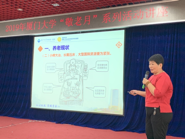 10月23日上午,由离退休工作处主办,厦门市爱心护理院协办的厦门大学敬老月“关爱离退休教职工”系列讲座第二讲在自钦楼多功能厅举行。爱心养老院院长杨美丽女士为老同志们带来题为“居家、社区与机构养老的发展趋势”的讲座。