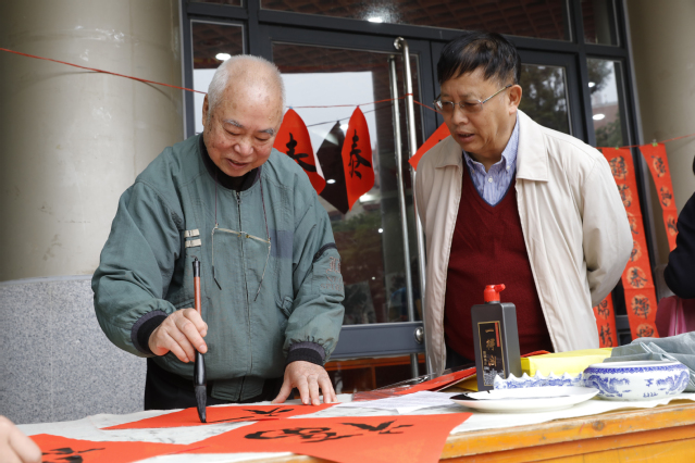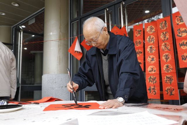 上午九点,来自厦门大学书画研究会的15位离退休老同志便泼墨挥毫,创作出春联、福字、国画、剪纸等书画作品,免费赠送给到场的厦大教职工、老同志和学生们。颜体、柳体、欧体,篆书、草书、隶书……一副副春联墨迹未干、底色鲜红,唤起了新春佳节的喜庆气氛,饱含着对新年的美好祝福和展望。当天小雨连绵,阻挡不了大家的热情,活动现场人头攒动、翰墨飘香、气氛融洽,大家早早选好称心如意的春联和书画作品,或是与书画研究会的老师交流习练书法的心得,或是围绕在心仪的老师桌前求一幅为自己“特制”的墨宝。共有近百幅书画作品送到了老师、同学们手上。