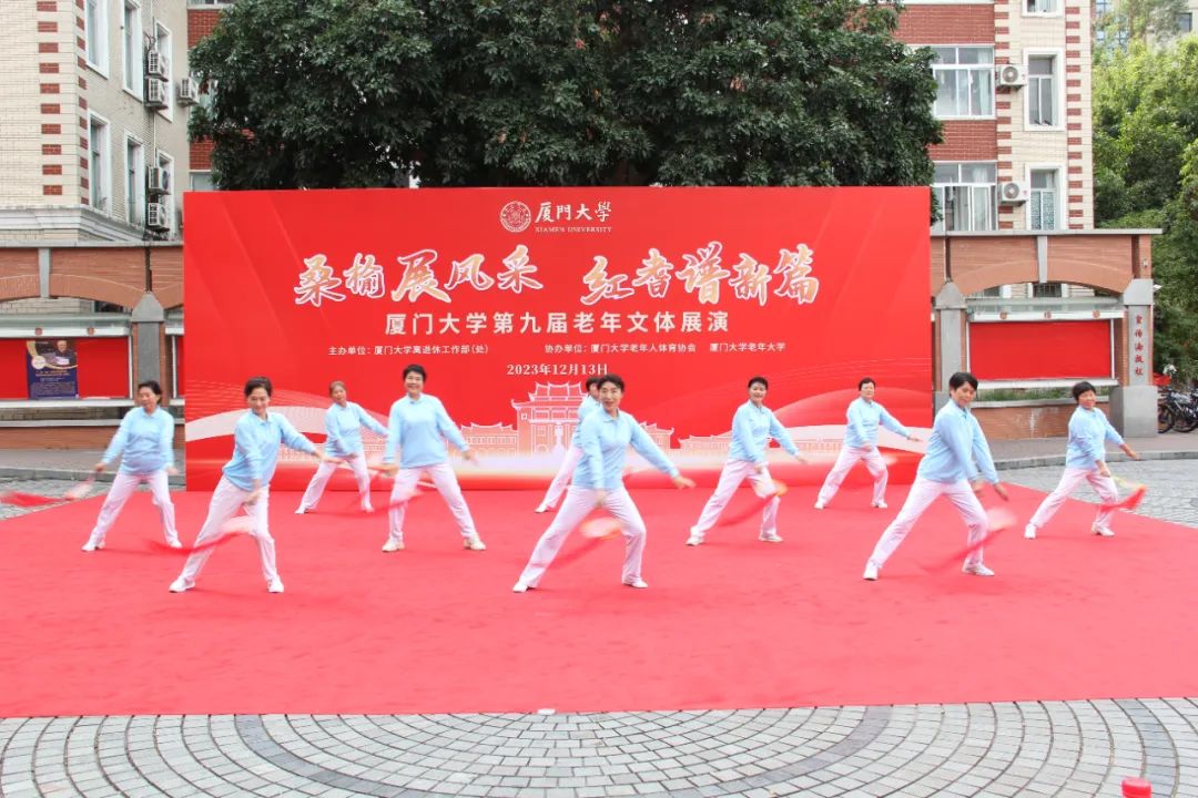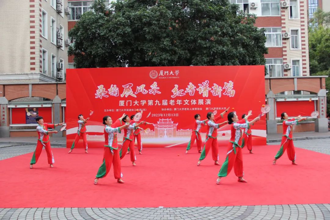 12月13日上午,“桑榆展风采 红耆谱新篇”厦门大学第九届老年文体展演在三家村学生活动广场举行。本次活动由离退休工作部主办,老年人体育协会和老年大学承办。离休干部卞守耆,老年大学校长陈国凤,校老体协主席詹心丽,老教授协会会长、校关工委副主任苏劲,离退休工作部部长曾坤瑜,老年大学和老体协班子成员、白城社区党委书记张丽娜,演武社区代表等出席并观看演出。来自老年大学、老体协和白城、演武、上李社区的12支老年文体队120多位老同志参加展演。