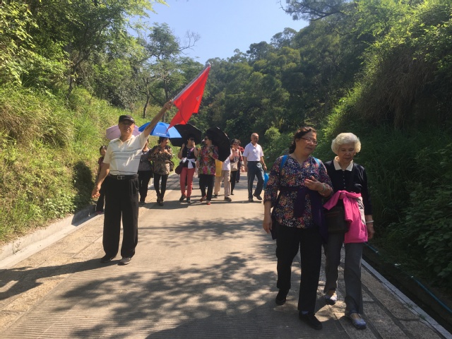 老同志陆陆续续从四面八方汇集到凌云路口,叙旧畅聊,熙熙攘攘,气氛热烈。上午八点半,登山活动准时开始,老同志们三五成群,沿着云凌路鱼贯而上,在老年大学和老体协的旗帜引领下,向山顶前行。