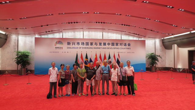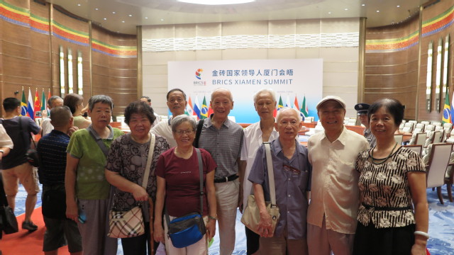 参观期间,交流不断。在习近平主席发表精彩演讲祝福金砖国家再创“金色十年”的海峡厅内,耳闻目睹祖国日新月异的发展变化、国际地位的显著提升,老同志们激动不已,民族自豪感洋溢满怀。方成族教授还欣然提笔成诗:“雅致庄严主场馆,运筹帷幄气轩昂,瀛寰仰慕金砖客,玉宇欢颜华夏强。”作为国家、厦门市及厦大建设发展的开拓者和见证人,老教授协会成员们一直坚持不断学习、提高思想认识、积极畅谈建言,以实际行动关心和支持十八大以来党和国家取得的新成就、社会和学校发展的新变化。站在厦门会晤这个重量级主场外交盛事会址上,他们不禁为中国走进国际舞台而欢呼,为全球治理拿出中国方案而自豪,为厦门的高素质高颜值而高兴!