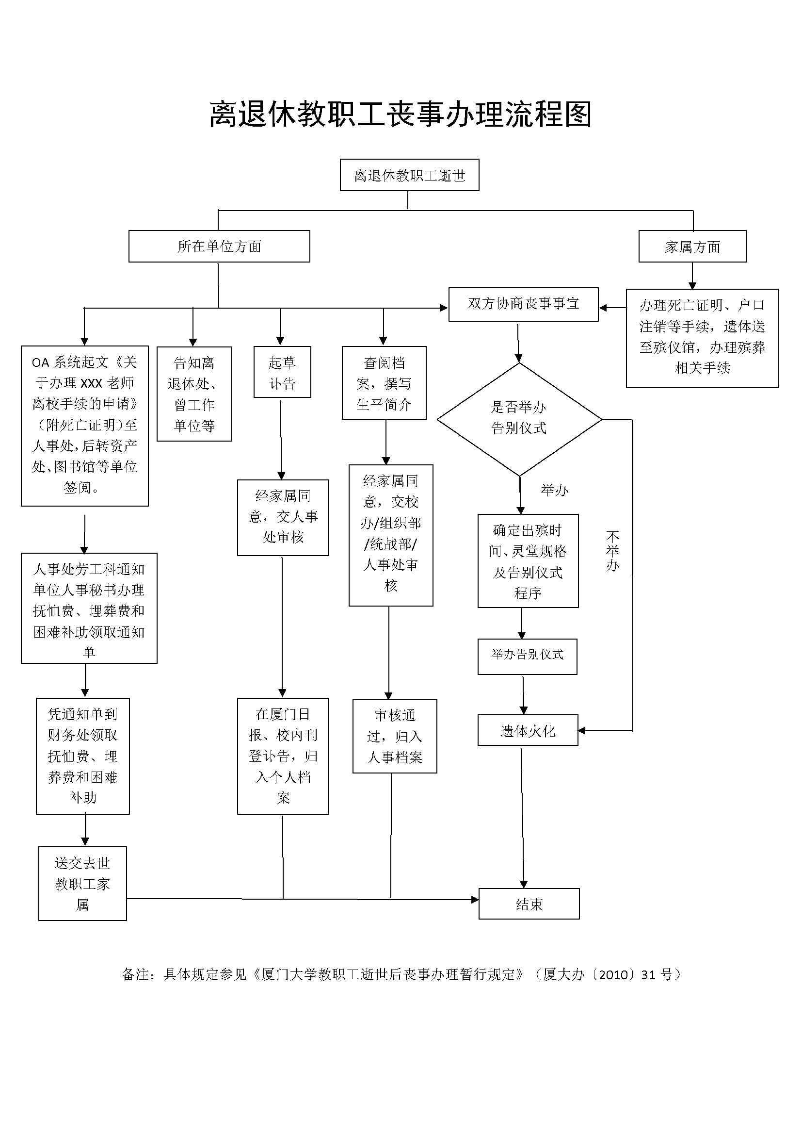 为进一步规范我校教职工逝世后丧事办理工作,根据《中共中央办公厅 国务院办公厅印发<关于党员干部带头推动殡葬改革的意见>的通知》(中办发〔2013〕23 号)的通知精神和《厦门大学教职工逝世后丧事办理暂行规定》(厦大办〔2010〕 31 号)要求,现将厦门大学教职工逝世后丧事办理程序明确如下: