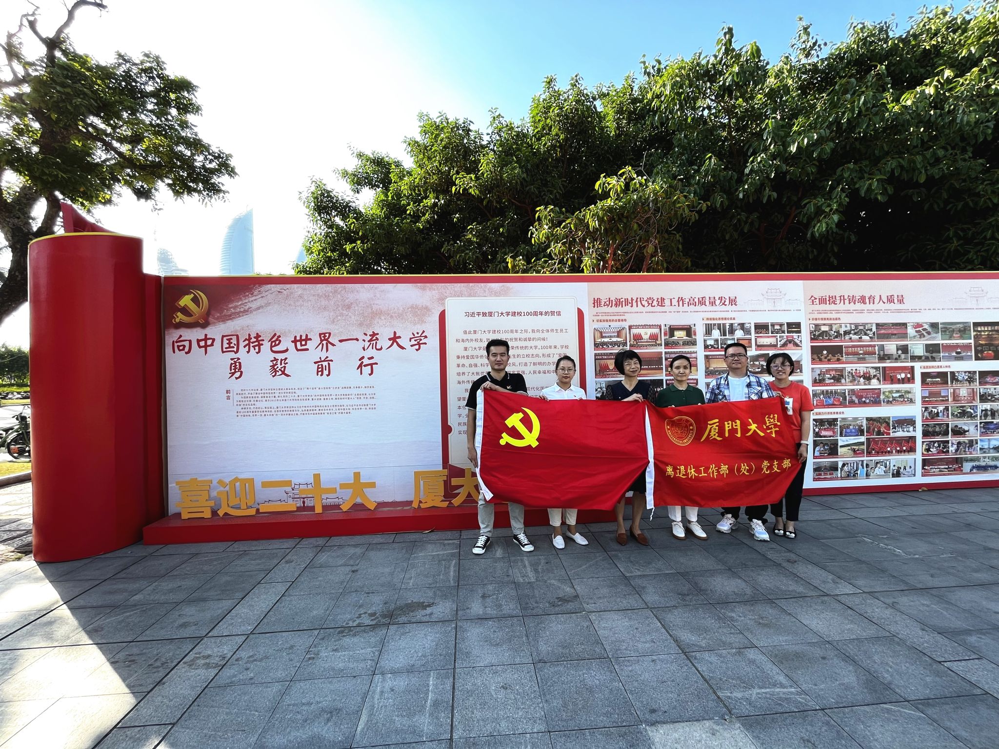 观影前,全体党员一起参观了伫立在科艺广场的“向中国特色世界一流大学勇毅前行”主题成就展长廊。大家聚焦厦门大学十年来的标志性成果展览照片,你一言、我一语,一张张照片唤醒了点滴入微的工作记忆,娓娓道来厦大人锐意创新、逐梦追梦的十年故事。大家一边深入探讨展览照片,一边步入影院。