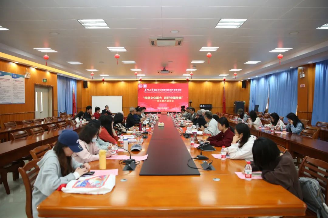 为深入学习贯彻习近平主席致2024世界中文大会贺信精神,推动国际中文教育高质量融合发展,4月8日上午,厦门大学国际中文教育学院/海外教育学院退休教工“六好”示范党支部(创建)联合研究生第二党支部,在学院C104会议室开展“传承文化薪火 讲好中国故事”——师生党支部共建活动。厦门大学关工委副主任梁卫中,厦门大学关工委秘书张红疆,厦门大学国际中文教育学院/海外教育学院党委书记、关工委主任许美霞,院长陈志伟,学院退休教工党支部书记、关工委常务副主任黄建军,学院团委书记、关工委秘书白沚凡,学院离退休教工党员代表、青年教师代表,研究生第二党支部全体党员参加活动。活动由黄建军主持。