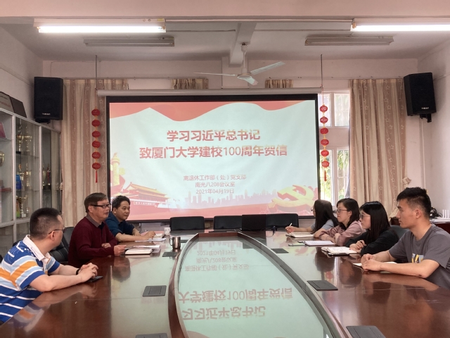 4月19日下午,离退休工作部(处)党支部开展“弘扬嘉庚精神 奋进一流征程”固定党日活动,组织全体在职党员集中学习习近平总书记致厦门大学建校100周年贺信精神。会议由离退休工作部党支部书记戴岩主持。