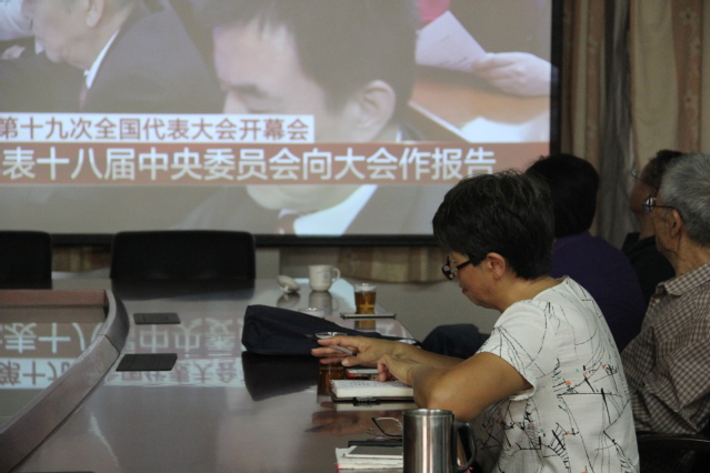 在学校统一组织下,部分离休干部代表、退休教工党支部书记代表、涉老组织负责人、退休教职工代表等20多位老同志齐聚南光八二楼离退休工作处会议室,集中收看了党的十九大开幕会直播,认真聆听习近平总书记代表第十八届中央委员会所作的报告。在三个半小时的直播过程中,老同志们始终紧紧盯着屏幕,聚精会神地聆听。