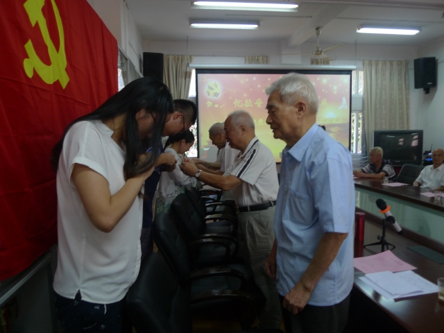 座谈会还邀请了人文学院学生党员代表列席参加。会上,老党员为青年党员一一佩戴党员徽章,寄托老党员的希望。青年党员也向老党员们献花以示敬意。