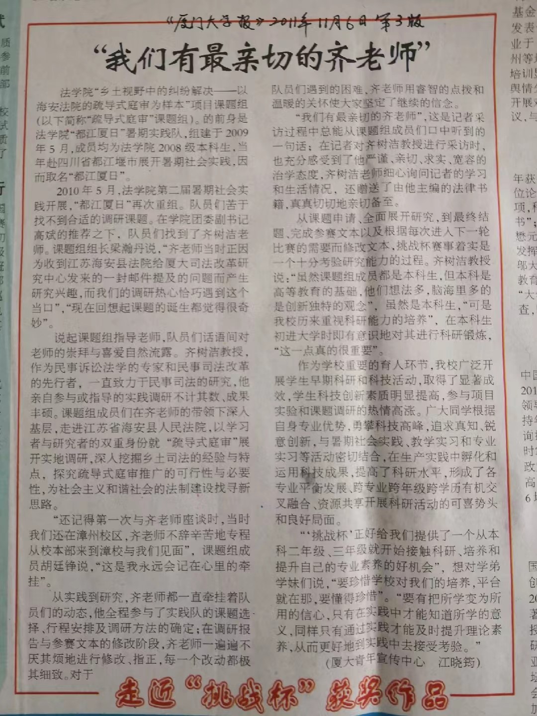 《厦门大学报》2011年11月6日版刊发学生文章《我们有最亲切的齐老师》