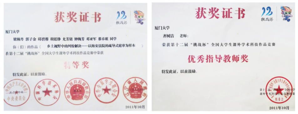 齐树洁教授2011年指导的学生课题组获全国挑战杯竞赛“特等奖”