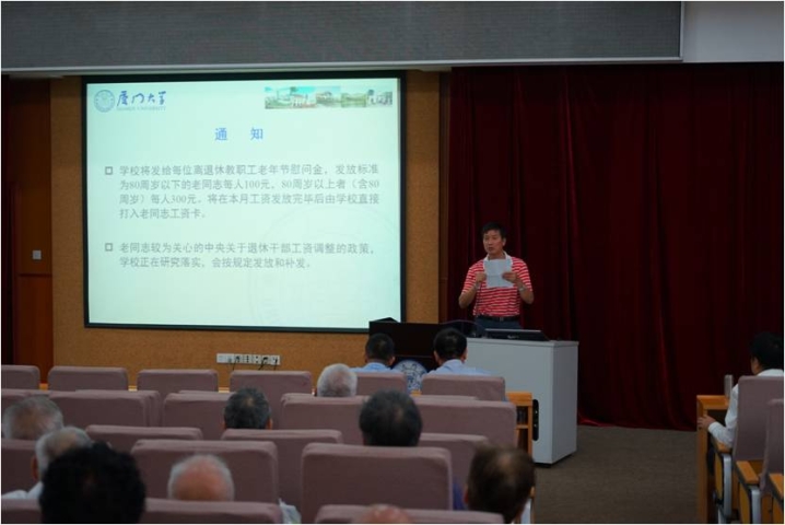 江云宝首先从师资队伍发展、重大平台建设、科学研究、创新人才培养、合作交流发展等多个方面向离退休教职工们通报了近来我院院情及进展情况。他表示我院的教师结构发生了重要变化,目前年轻教师超过了四分之一,呈现师资队伍可持续发展的良好趋势;研究的模式也发生了变化,在保持传统优势学科基础上,加强了学科交叉发展;运行模式发生了变化,教师教学科研素质均在高层次水平。江院长说,化院有许多老同志退而不休,时刻关注着学院的工作,活到老,奉献到老。学院充分重视老龄工作,支持老同志从教学、科研、党建方面给予指导,“老有所为”。学院十分关心老同志,举办了多项活动,继承学院尊老敬老的优良传统。希望这些优良传统可以在学院代代传承。