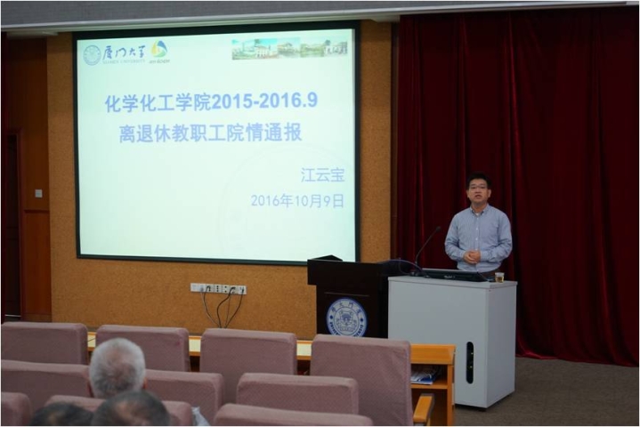 金秋送爽,正值九九重阳。为弘扬中华民族尊老敬老的传统美德,传承学院良好传统,化学化工学院于10月9日(农历九月初九)在化学报告厅为全院教职工离退休教职工及60岁以上在职人员举办茶话会,向全体老教师送上重阳节的关心与祝福。院长江云宝、党委书记林辉代表学院向老教师致以慰问并发表讲话。