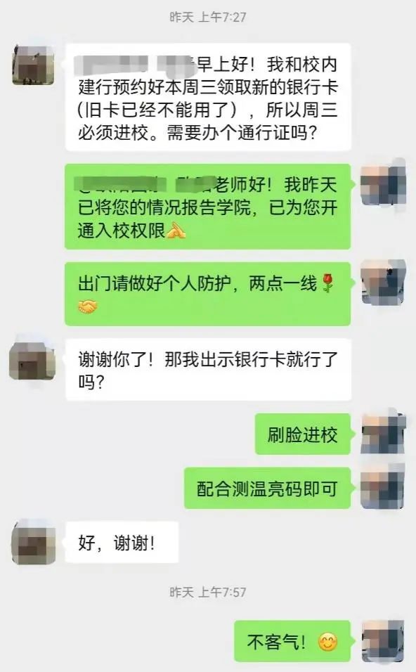“今天您有没有做核酸?出门检测多添些衣服,最近降温了。”“家中有人照料么?您出门取东西要做好防护,不要扎堆聚集……”“绿码转黄?您别急,我先咨询一下,有消息马上告诉您”。网格员坚守岗位,密切关注老同志动向。在学校实行封闭式管理期间,通过电话、微信等方式耐心解答老同志及其家属关于疫情和疫情防控工作的各种疑问,特殊时期,虽然不能面对面,但是学院随时准备提供帮助和支持,为他们送去学院的关怀关爱,形成了一张以感情的温度、工作的热度、专业的精准度所织就的帮扶网络。