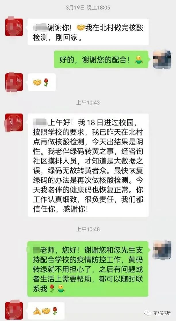 网格员通过微信、打电话等方式逐一核实摸排离退休同志情况,准确掌握离退休同志的出行轨迹。疫情期间,有的老同志们的信息接收不畅,电话打不通,网格员及时多方联系其亲属及所在社区,克服困难,及时了解老同志的出行轨迹、生活起居、身体和心理状况等,做老同志们的“贴心人”。“我在18日进过校园,按照学校的要求,我已昨天在北村点再做核酸检测,今天出结果是阴性。”老同志们也给予了充分的理解和配合。