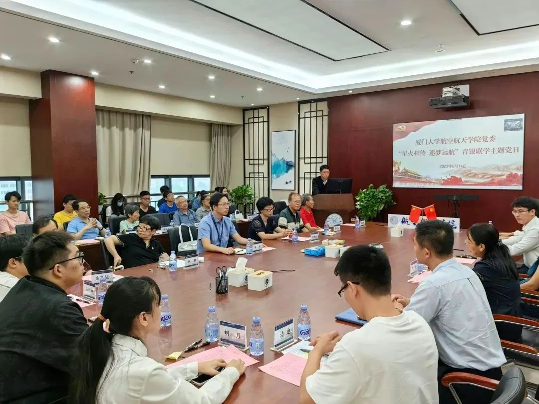 最后,退休教工党员以“星火相传•逐梦远航”为主题与毕业生党员代表开展联学主题党日活动。退休教工党支部书记蔡建立表示,青年人应该是朝气蓬勃的一代,有理想、有抱负、能奋斗,拒绝躺平,他期望学生党员终身学习,将个人的“小我”融入国家的“大我”。“福建省教育系统关心下一代工作先进工作者”获得者黄信安分享了自己的人生经历,寄语毕业生党员要厚植空天情怀,在新的人生岗位中牢记初心使命、后来居上。随后,退休党员林麒、吴孙桃分别为新转正毕业生党员代表佩戴党员徽章,寄予老党员对新党员“星火相传”的力量。