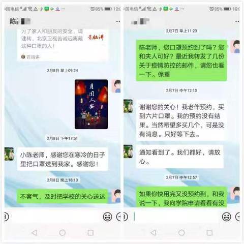 2月8日元宵节当天,在墨尔本校友的物资支持下,学校为在厦的离退休老师发放口罩。正值疫情期间,出行不便,但是各系在职教工党支部书记、党员、工会小组长都积极行动,一个下午,6位老师分三组分别辗转几十户人家,为退休教工老师送口罩上门,送上关心与问候。哲学系教工党员、工会小组长陈玲老师在朋友圈分享道:“没想到最近刷屏的口罩航班也有我们厦大校友的爱心,下午和美女老师一起给离退休老师送捐赠的口罩,虽困难重重,但墨尔本校友的感恩之心仍深以感怀。”