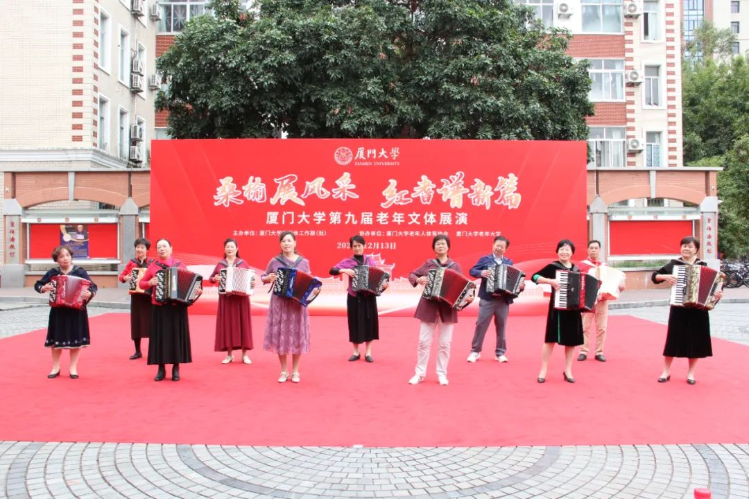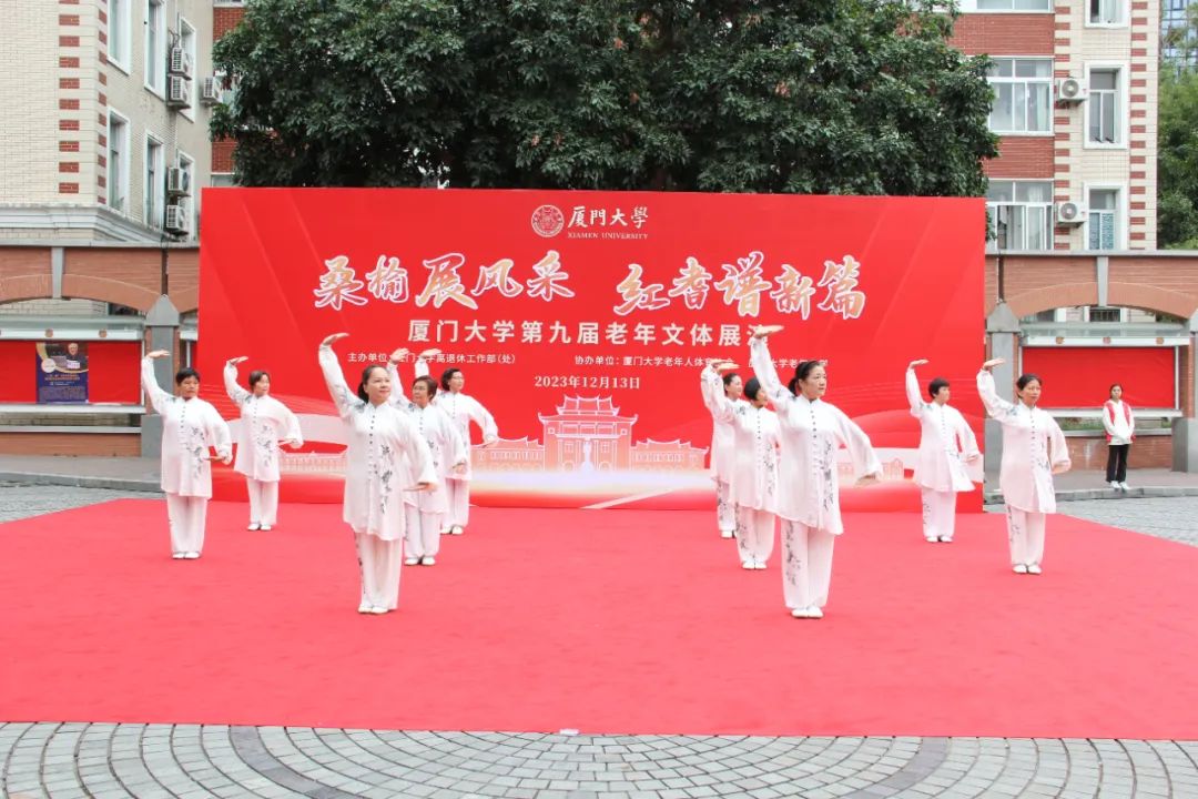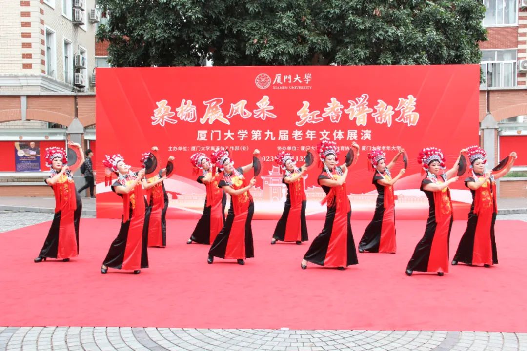 12月13日上午,“桑榆展风采 红耆谱新篇”厦门大学第九届老年文体展演在三家村学生活动广场举行。本次活动由离退休工作部主办,老年人体育协会和老年大学承办。离休干部卞守耆,老年大学校长陈国凤,校老体协主席詹心丽,老教授协会会长、校关工委副主任苏劲,离退休工作部部长曾坤瑜,老年大学和老体协班子成员、白城社区党委书记张丽娜,演武社区代表等出席并观看演出。来自老年大学、老体协和白城、演武、上李社区的12支老年文体队120多位老同志参加展演。